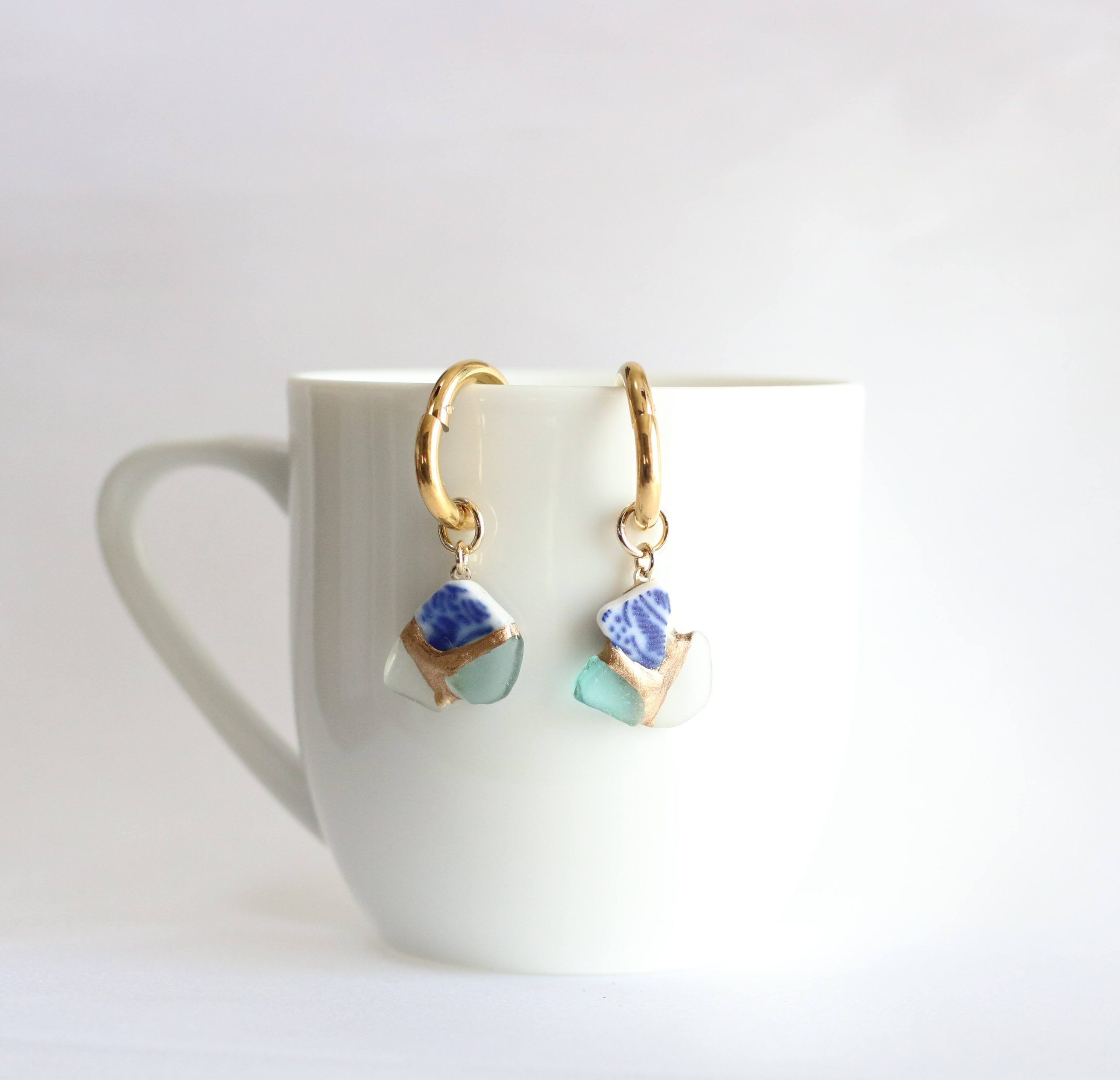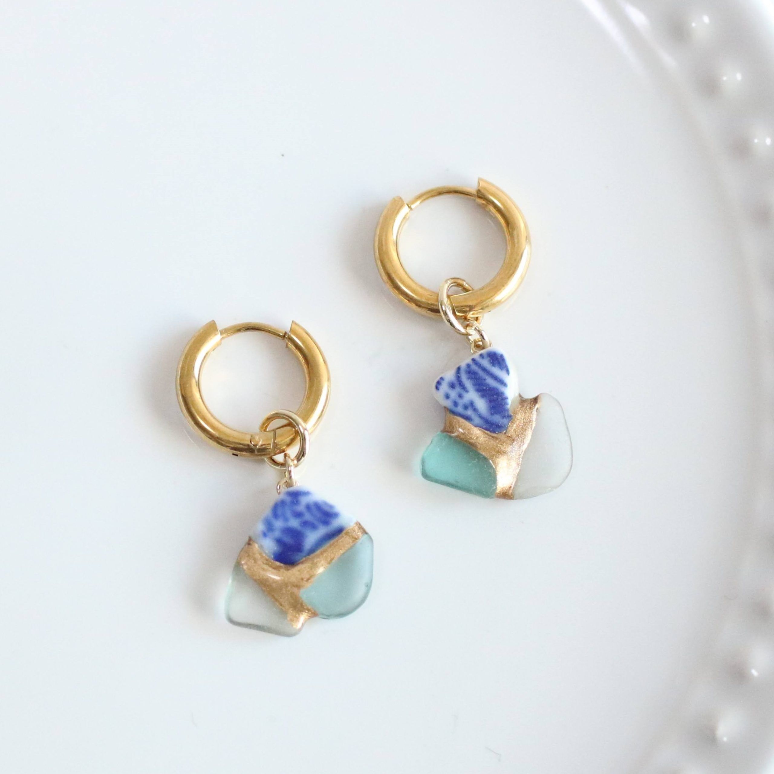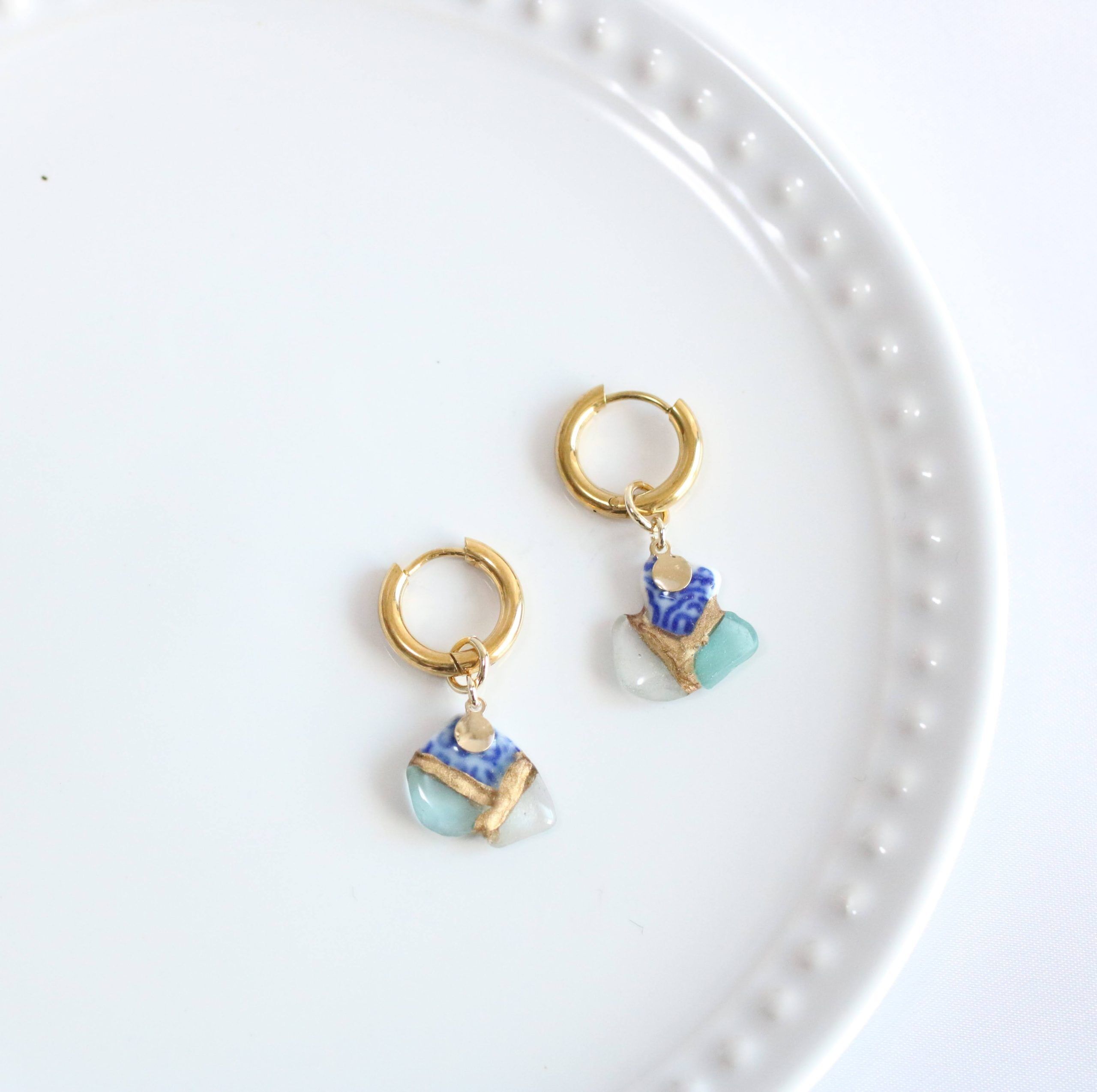 Experience the art of Kintsugi with our unique collection of Kintsugi Hooped Earrings, crafted from found aquamarine sea glass and ceramic fragments from the beaches of Shizuoka, right at the foot of the majestic Mt. Fuji.