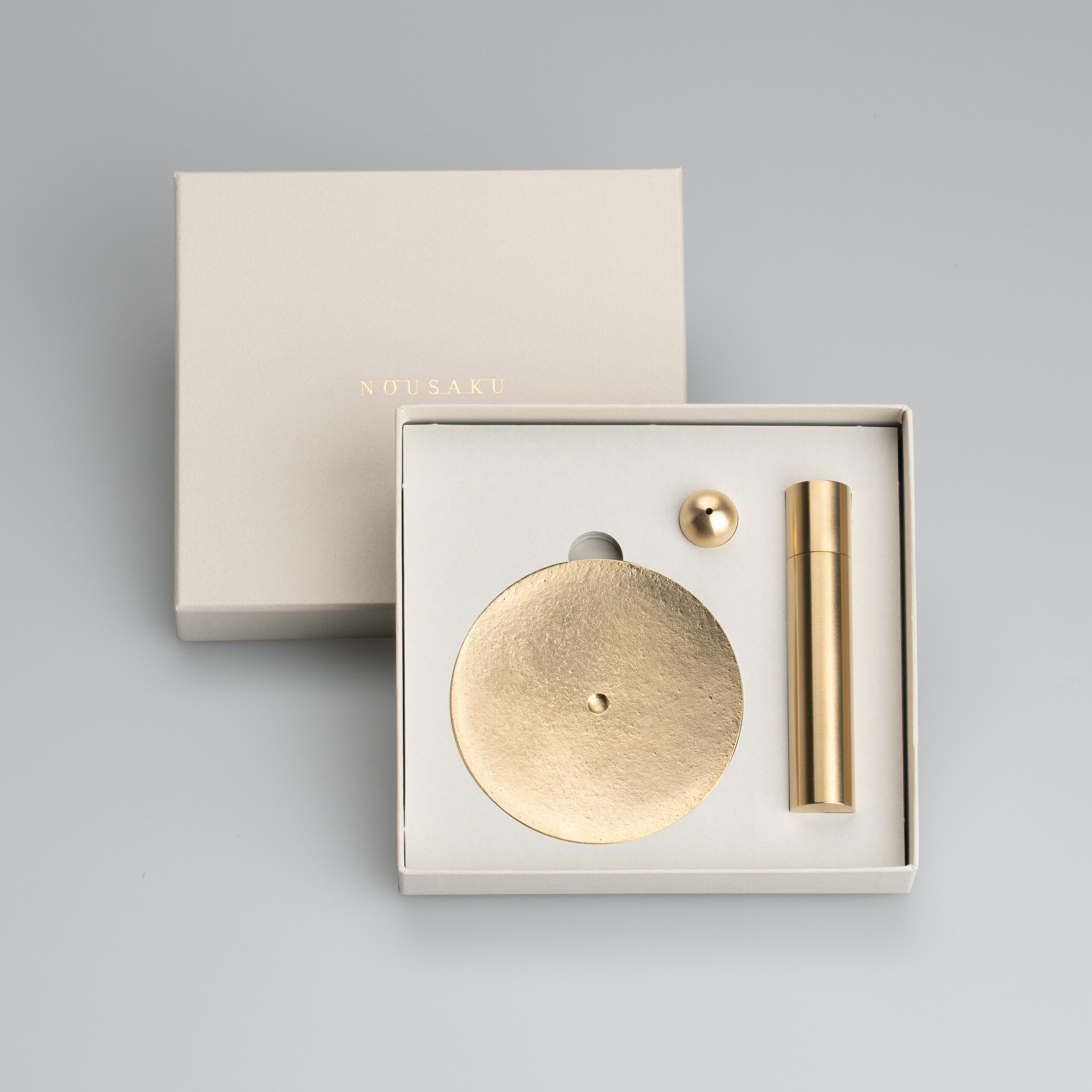The set features a minimalist yet sophisticated design, including a sleek brass dish and an incense holder. Its clean lines and understated beauty make it a perfect addition to any modern home.