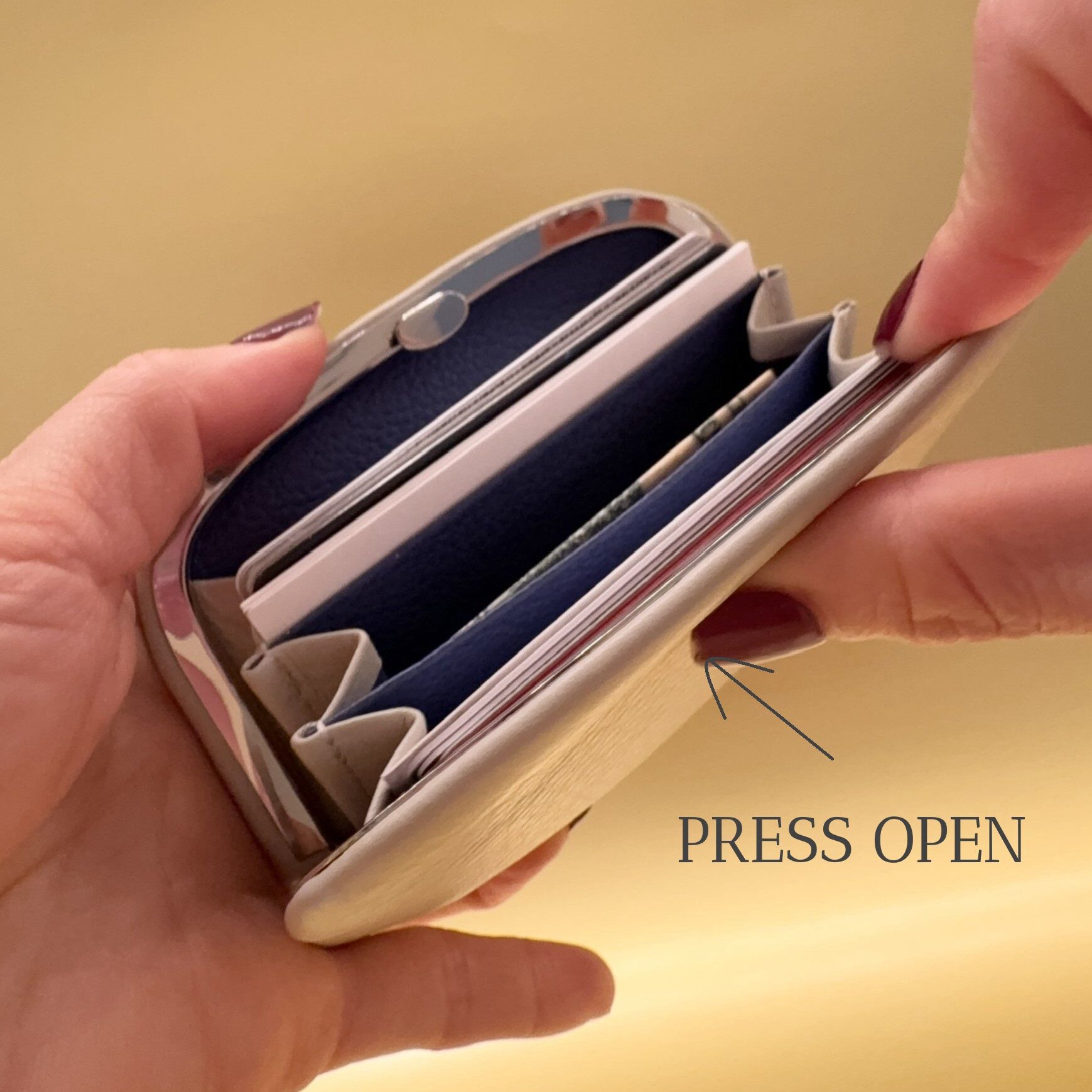- Bills: Can be stored in three compartments by folding them into halves.